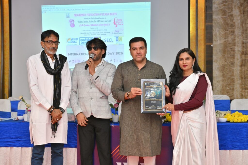 અમદાવાદ: પ્રોગ્રેસિવ ફાઉન્ડેશન ઓફ હ્યુમન રાઇટ્સ (PFHR) દ્વારા આંતરરાષ્ટ્રીય મહિલા દિવસ 2026 ના પાવન અવસરે અમદાવાદમાં એક ભવ્ય રાષ્ટ્રીય સંમેલનનું આયોજન કરવામાં આવ્યું હતું. “અધિકાર, ન્યાય અને કાર્યવાહી: તમામ મહિલાઓ અને બાળકીઓ માટે” (Rights. Justice. Action. For All Women and Girls) વિષય હેઠળ યોજાયેલા આ કાર્યક્રમમાં મહિલા સશક્તિકરણ અને સામાજિક ન્યાય પર ભાર મૂકવામાં આવ્યો હતો. આ સમગ્ર કાર્યક્રમનું સંચાલન PFHR ના રાષ્ટ્રીય પ્રમુખ શ્રી રાકેશ પાંડેના અધ્યક્ષસ્થાને કરવામાં આવ્યું હતું